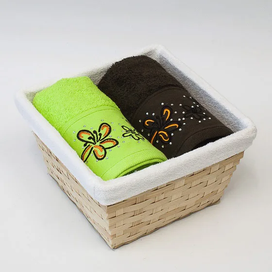 Košík s froté textilní vsadkou obsahuje 2 ks bavlněných ručníků o rozměrech 50x100 cm. Ručník je opatřen krásnou moderní výšivkou. Košík je součástí balení.