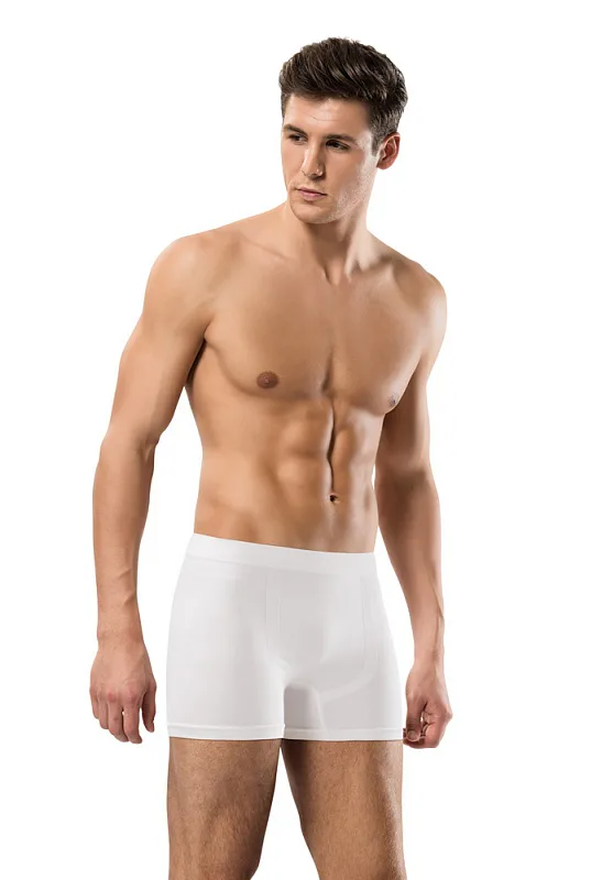 Bílé pánské bezešvé boxerky ze směsi mikrovlákna (85 %) a elastanu (15 %) pro pohodlné nošení. Vysoká kvalita materiálu zaručuje tvarovou stálost a dlouhou životnost.