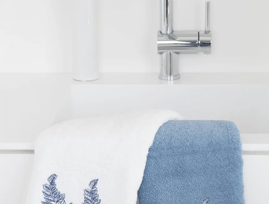 - pastelově modrý ručník, výšivka s florálním motivem