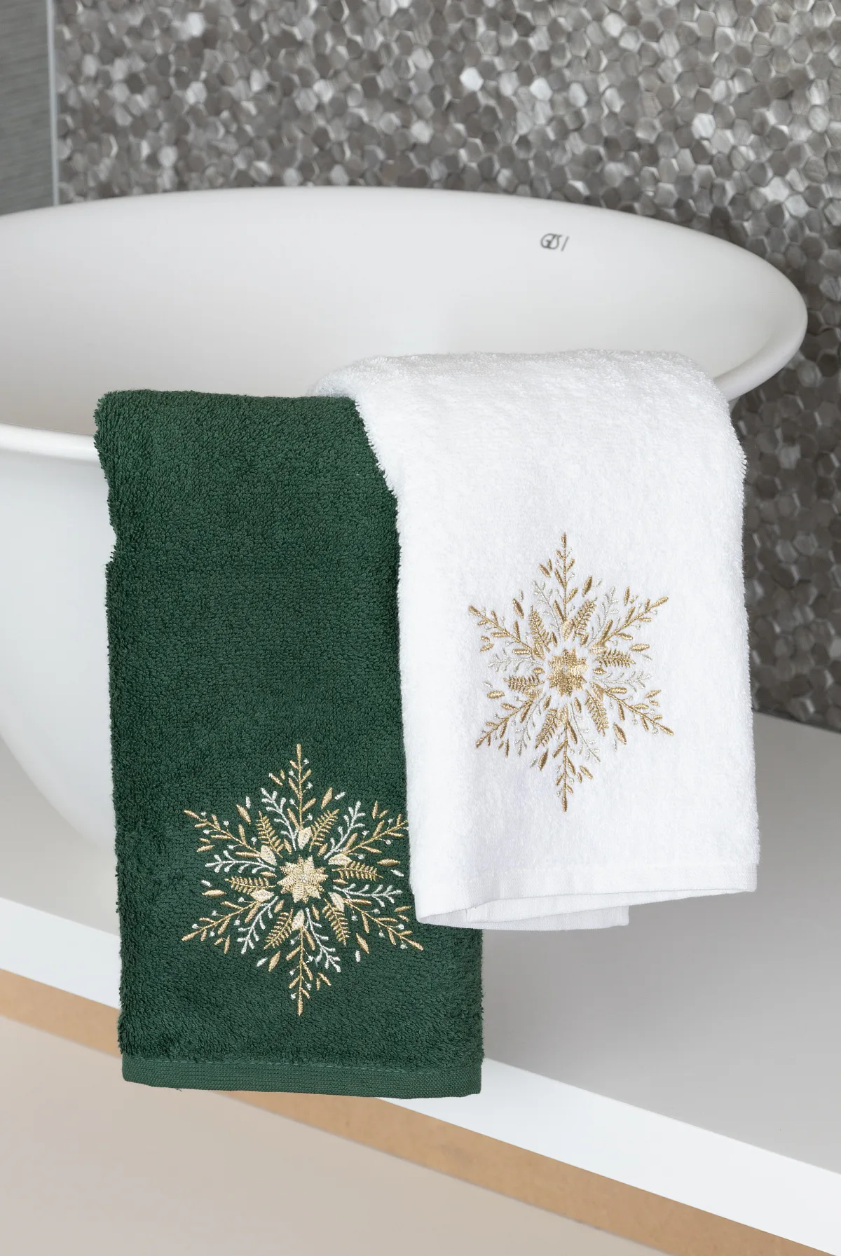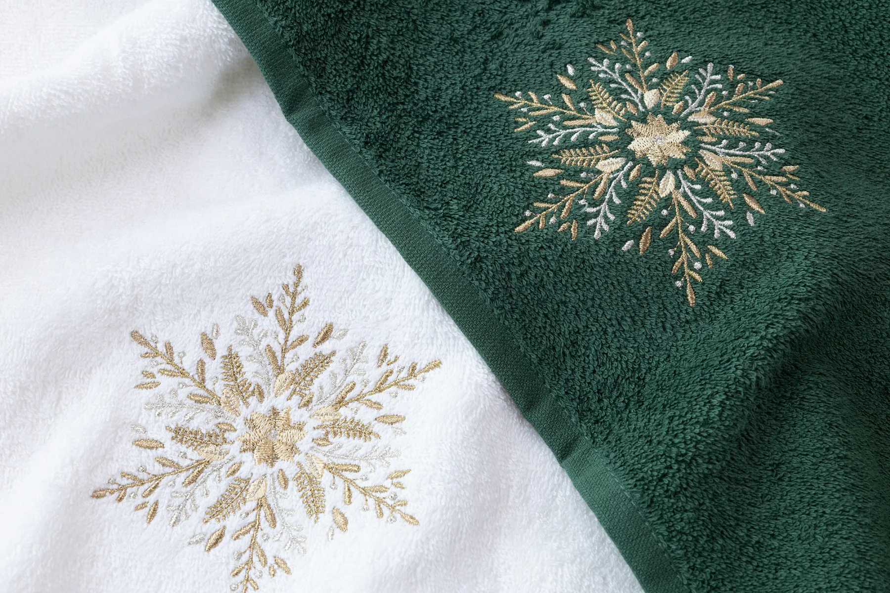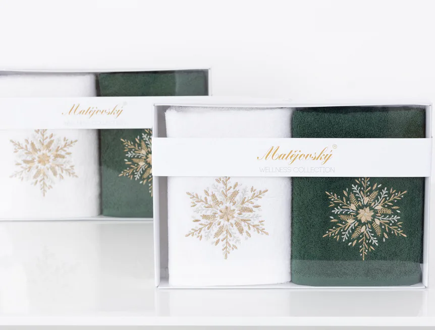 • zelený ručník, výšivka s motivem sněhové vločky