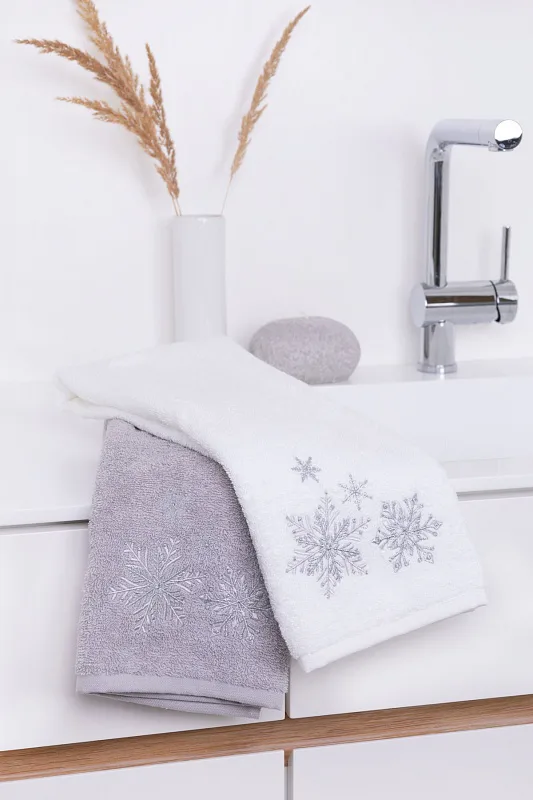 • šedý ručník, výšivka s motivem sněhových vloček