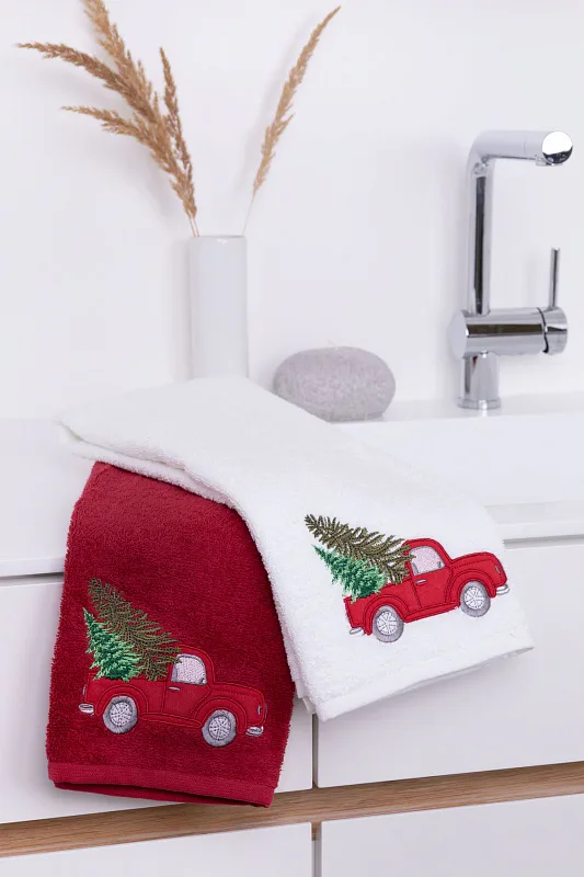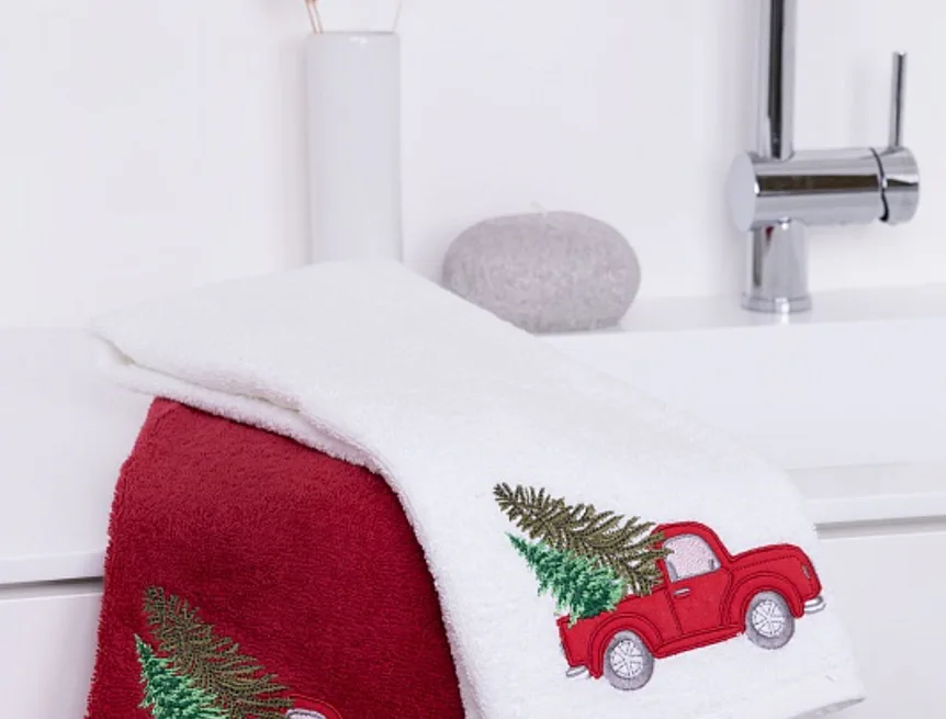 • červený ručník, výšivka s motivem auta a vánočního stromku