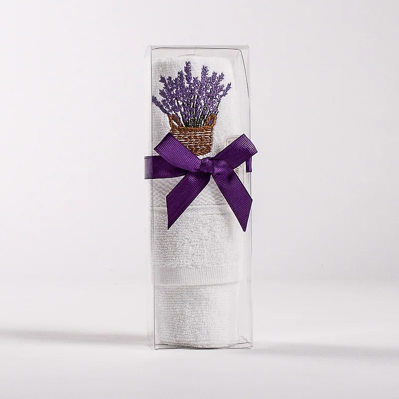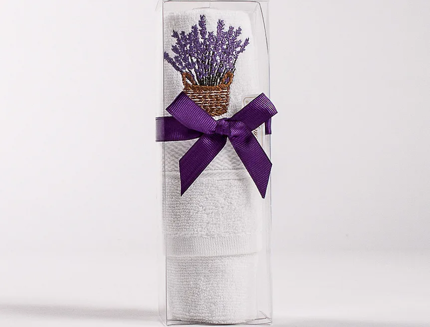 Originální dárkově balený bílý ručník 30x50 cm ze 100% bavlny s výšivkou levandule. Potěšte své blízké praktickou maličkostí.