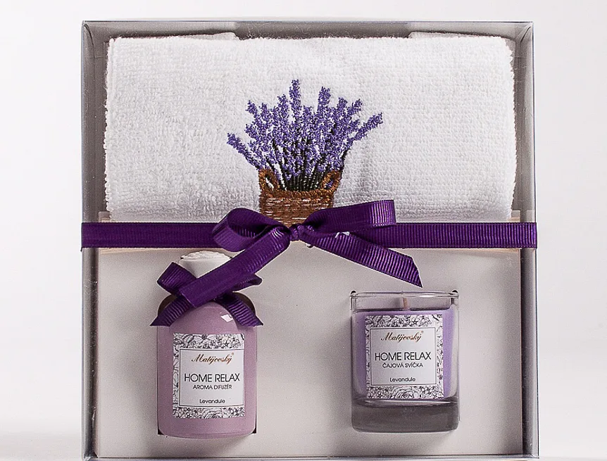 Dárkově balený set ručníku, svíčky ve skle a vonného difuzéru potěší každého milovníka praktických dárků.