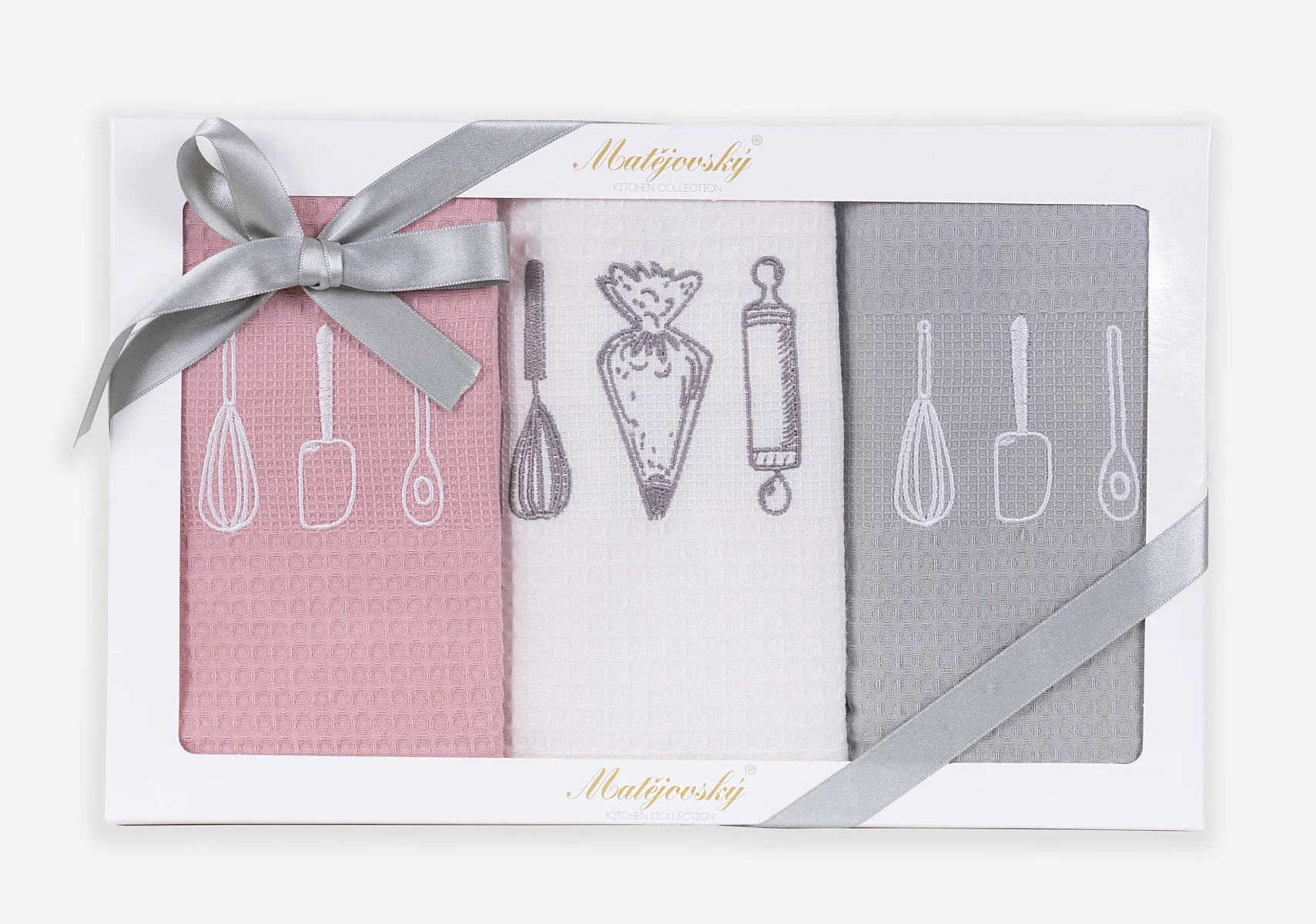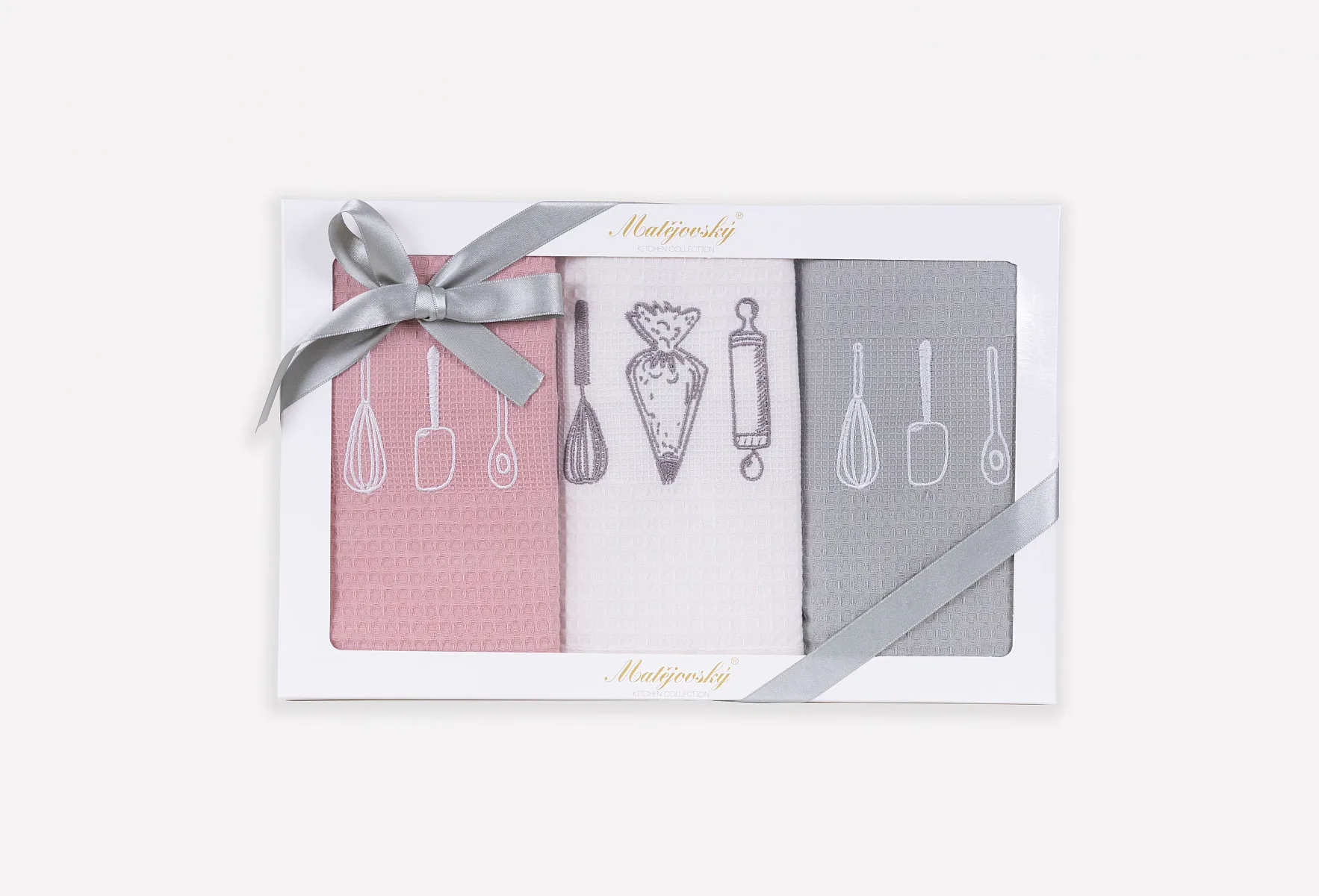 Lesklá dárková krabička s barevně sladěnou stuhou je nedílnou součástí sady. Utěrky splňují kritéria mezinárodní certifikace Oeko-Tex Standard 100.