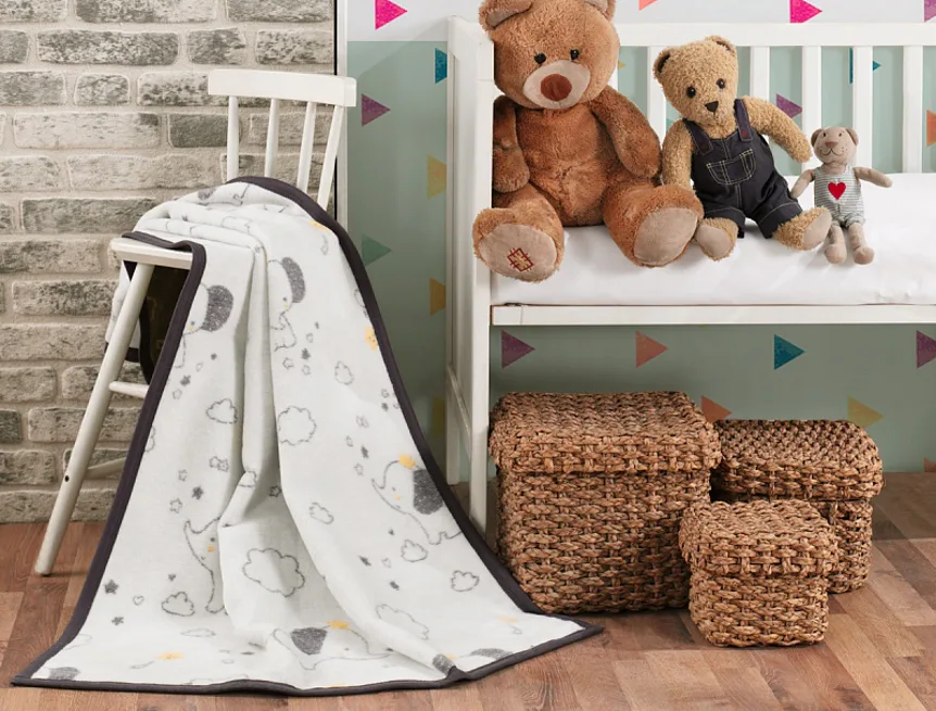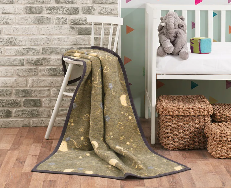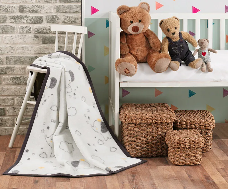 Dětská deka Bimbo s vysokým podílem bavlny a hustým vlasem, hřejivá a hebká na dotyk, se stane skvělým společníkem v dětském pokojíčku, nebo třeba v kočárku. Roztomilé slůně obklopují decentní vzory v hnědobílém provedení s jemnými žlutými tóny. Deka je z druhé strany v inverzním barevném provedení (světlé motivy a okraj na tmavším žíhaném podkladu).