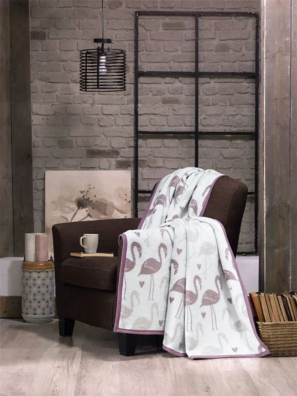 Luxusní bavlněná deka s hustým vlasem, hřejivá a hebká na omak. Nová receptura tkaní je zárukou lehkosti a skvělé prodyšnosti. Deka DARK FLAMINGO bude jedinečným doplňkem vašeho domova a nepostradatelným společníkem pro chladné večery. Atraktivní, ale přesto velmi něžný motiv s plameňáky v hnědofialové a béžové barvě na přírodním bílém podkladu zaujme každého vyznavače současných trendů. Spodní strana deky je provedena inverzně.