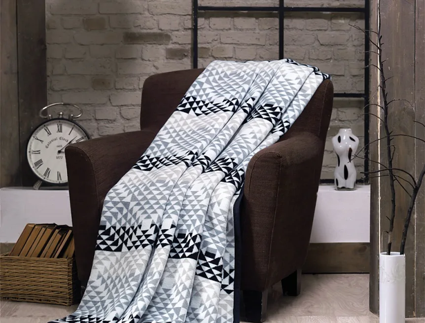 Luxusní bavlněná deka s hustým vlasem, hřejivá a hebká na omak. Nová receptura tkaní je zárukou lehkosti a skvělé prodyšnosti. Deka DIEGO bude jedinečným doplňkem vašeho domova a nepostradatelným společníkem pro chladné večery. Drobvný trojúhelníkový motiv s kombinuje odstíny černé, šedé, světle hnědé a přírodní bílé. Spodní strana deky je provedena inverzně.