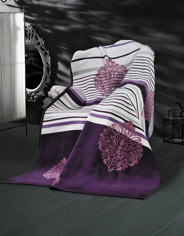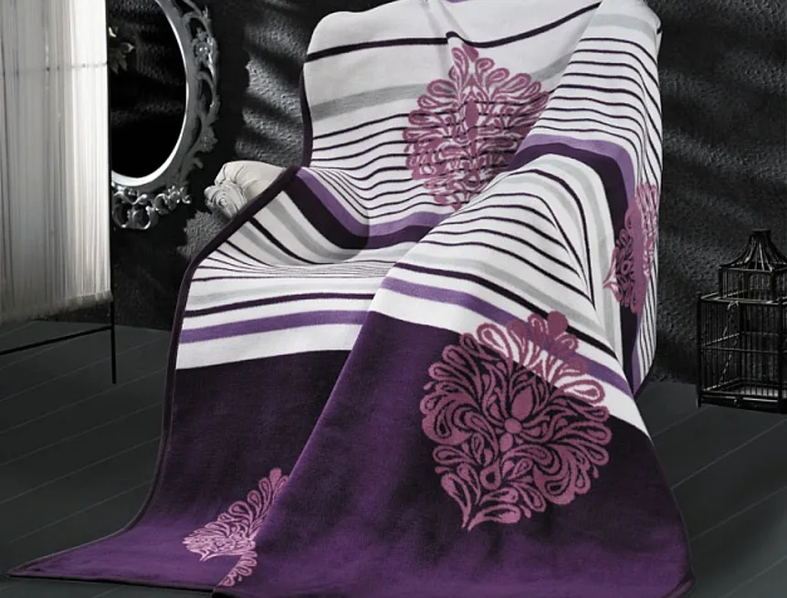 Exkluzivní deka s hustým vlasem, hřejivá a sametová na omak. Atraktivní dezén DOLCE je zárukou, že deka bude jedinečným doplňkem Vašeho domova a nepostradatelným společníkem pro chladné večery. Deku můžete elegantně využít i jako ozdobný přehoz. Deka je olemována tmavě fialovou lemovkou, kombinuje bohatý vzor a rovné linie v barvách bílé a královské fialové.