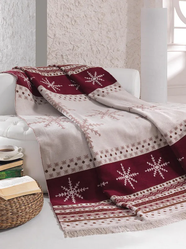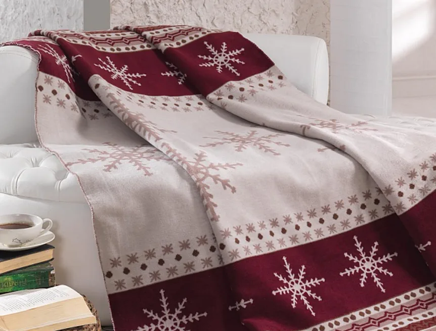 Krásný zimní motiv vloček na dece v teplých odstínech hnědé a bordó.