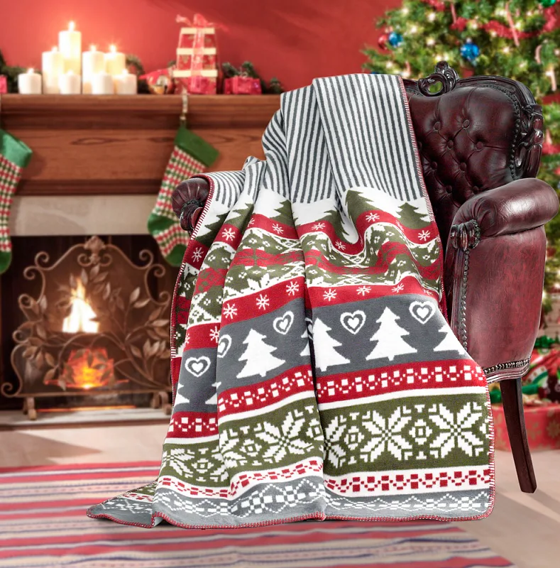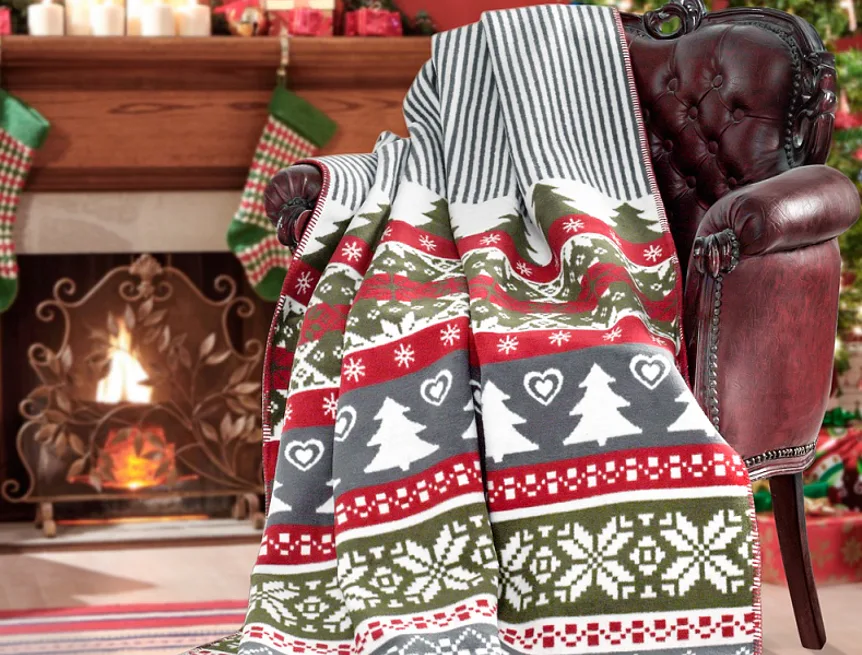 Luxusní bavlněná deka s hustým vlasem, hřejivá a hebká na omak. Deka FIESTA bude jedinečným doplňkem vašeho domova a nepostradatelným společníkem nejen pro sváteční večery. Tradiční vánoční motiv v typickém barevném provedení červené, zelené, bílé a šedé. Druhá strana deky je provedena inverzně (tmavé prvky jsou světlé).