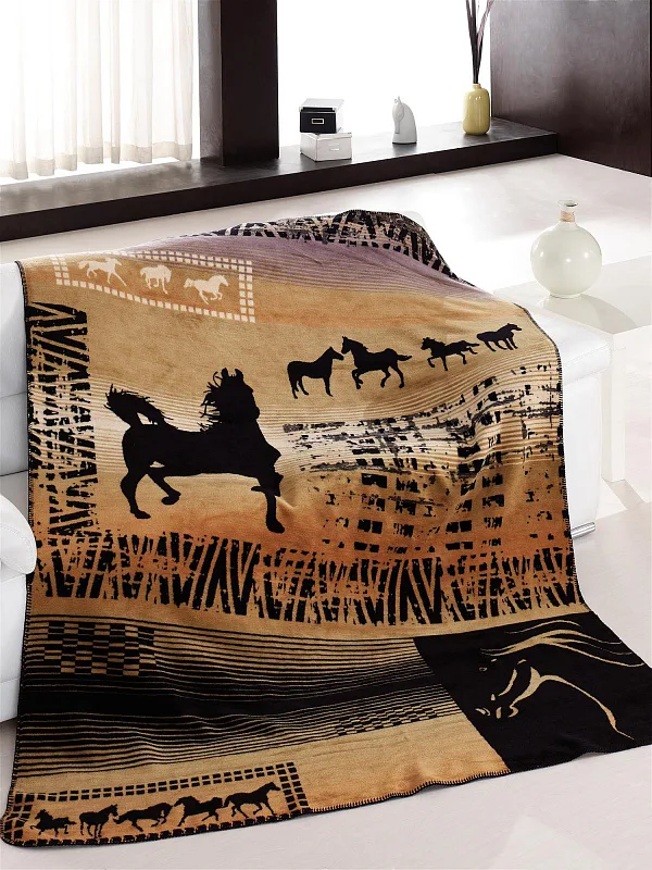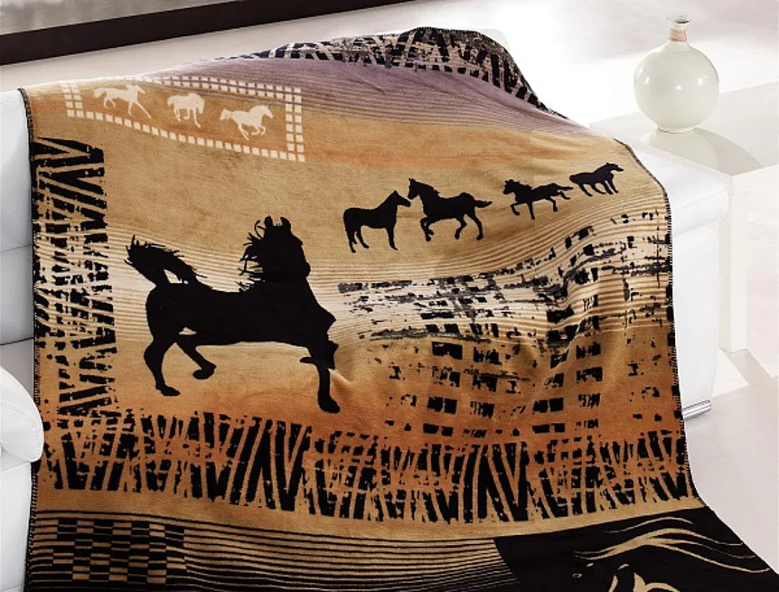 Luxusní deka GUINEA s hustým vlasem, hřejivá a sametová na omak. Atraktivní dezén zajistí, že deka bude jedinečným doplňkem vašeho domova a nepostradatelným společníkem pro chladné večery. Černé siluety koní zajímavě kontrastují s nugátově hnědými a béžovými tóny.