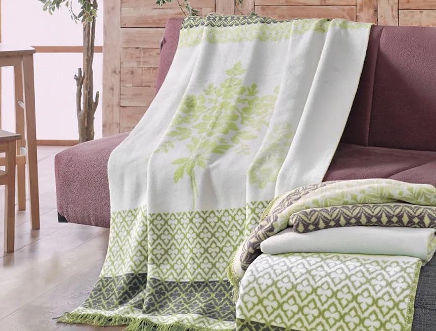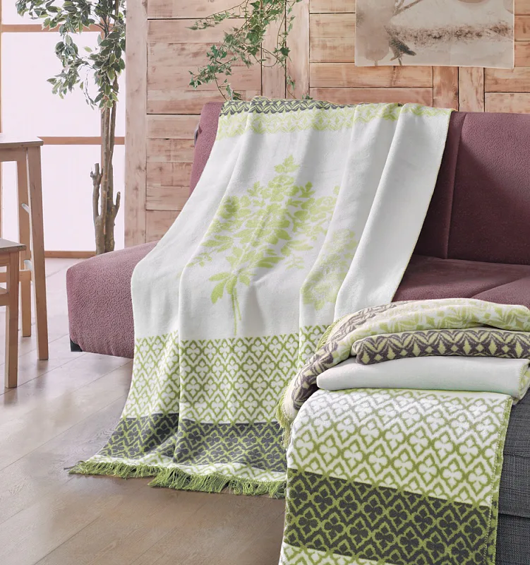 Luxusní bambusová deka s hustým vlasem, hřejivá a mimořádně hebká na omak. Deka LENTO bude jedinečným doplňkem vašeho domova a nepostradatelným společníkem pro chladné večery. Elegantní kombinace florálního a geometrického motivu v zářivém olivově zeleném provedení na smetanovém podkladu s šedými prvky. Druhá strana deky je provedena inverzně (světlý motiv na zeleném podkladu).