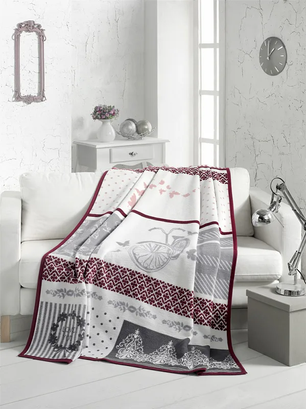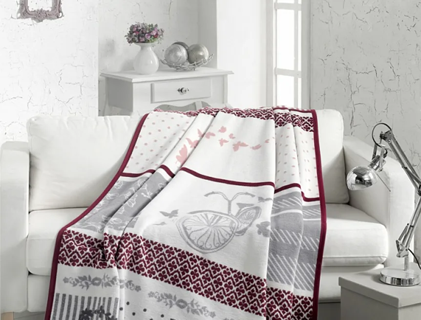 Deku můžete elegantně využít i jako ozdobný přehoz. Deka je po celém obvodu olemována sytě vínovou lemovkou.