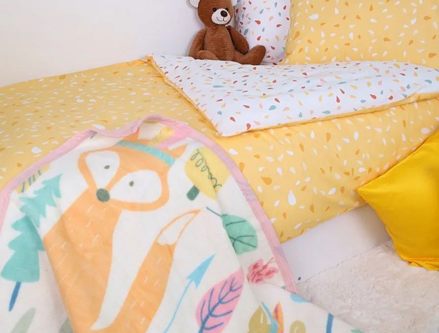 Deka je z druhé strany jednobarevná - světle růžová barva na zadní straně deky je sladěna s lemovkou, kterou je deka olemována po celém obvodu.