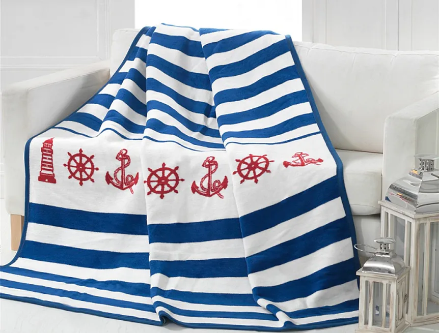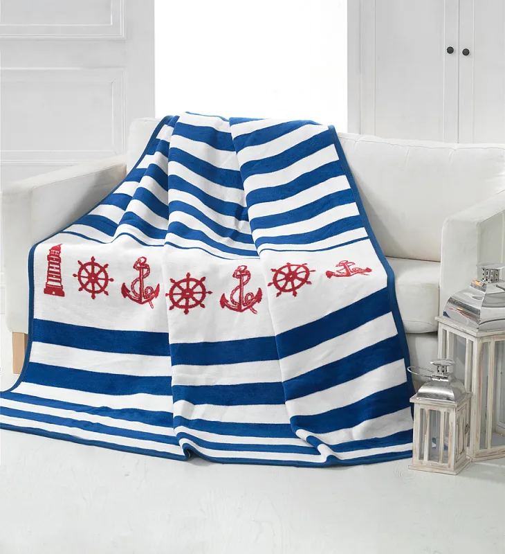 Luxusní bavlněná deka s hustým vlasem, hřejivá a hebká na omak. Oblíbený námořnický dezén MARINE bude jedinečným doplňkem vašeho domova a nepostradatelným společníkem nejen pro chladné večery. Zářivé odrobílé pruhy jsou doplněny o červené námořnické motivy. Druhá strana deky má ozdobný pruh červený s bílými námořnickými motivy.