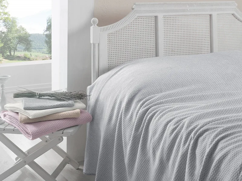 Stylové deky jsou nezbytnou součástí každého interiéru. Inspirujte se novou kolekcí hebkých plédů. Atraktivní pletený vzor a dokonale sladěné pastelové odstíny přírodní bílé a kovově šedé v kombinaci s jemným povrchem z přírodního materiálu přímo svádí k zachumlání.