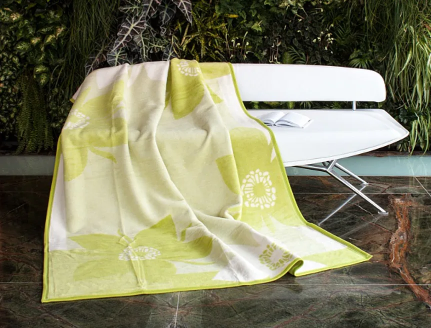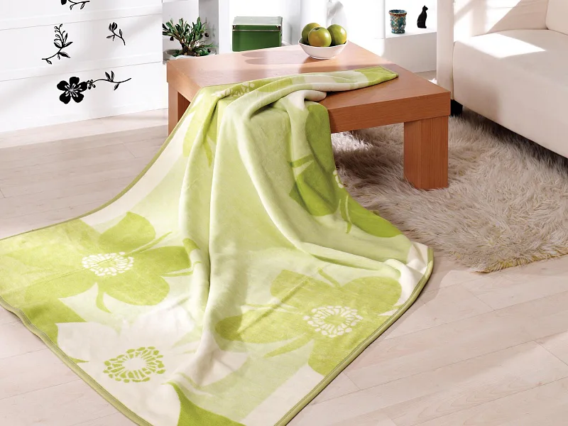 Deku můžete elegantně využít také jako ozdobný přehoz. Deka je olemována zelenou lemovkou.