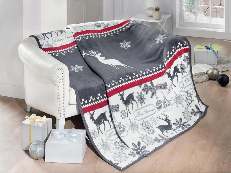 Luxusní deka s hustým vlasem, hřejivá a sametová na omak. Atraktivní sváteční dezén RONY zajistí, že deka bude jedinečným doplňkem vašeho domova a nepostradatelným společníkem pro chladné večery. Pastelové odstíny sytě červené, antracitové a bílé dokonale kontrastují a podtrhují tak vánočně laděný vzor se soby. Deka je olemována lemovkou v antracitové barvě. Můžete ji elegantně využít i jako ozdobný přehoz.
