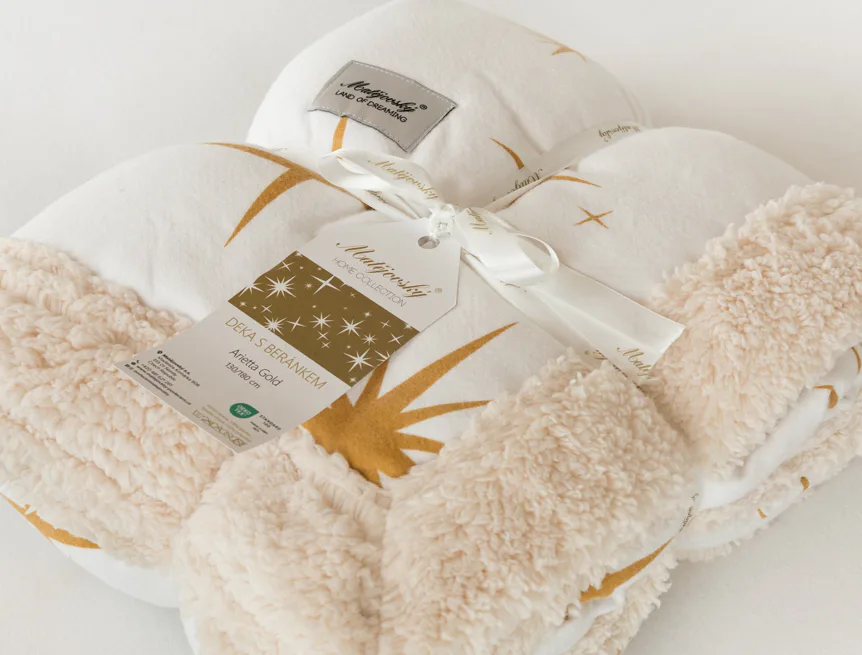 Díky pečlivě vybraným motivům, které lze kombinovat s ložním povlečením a dalšími bytovými doplňky, nesmí beránková deka Arietta Gold chybět ve vaší domácí oáze klidu a pohody.