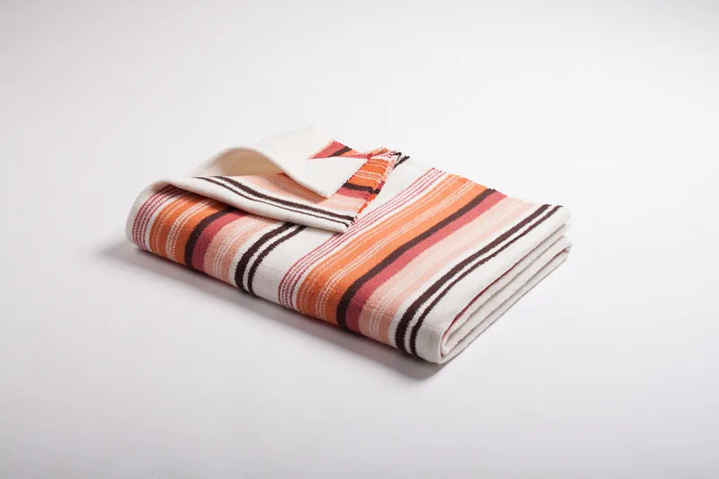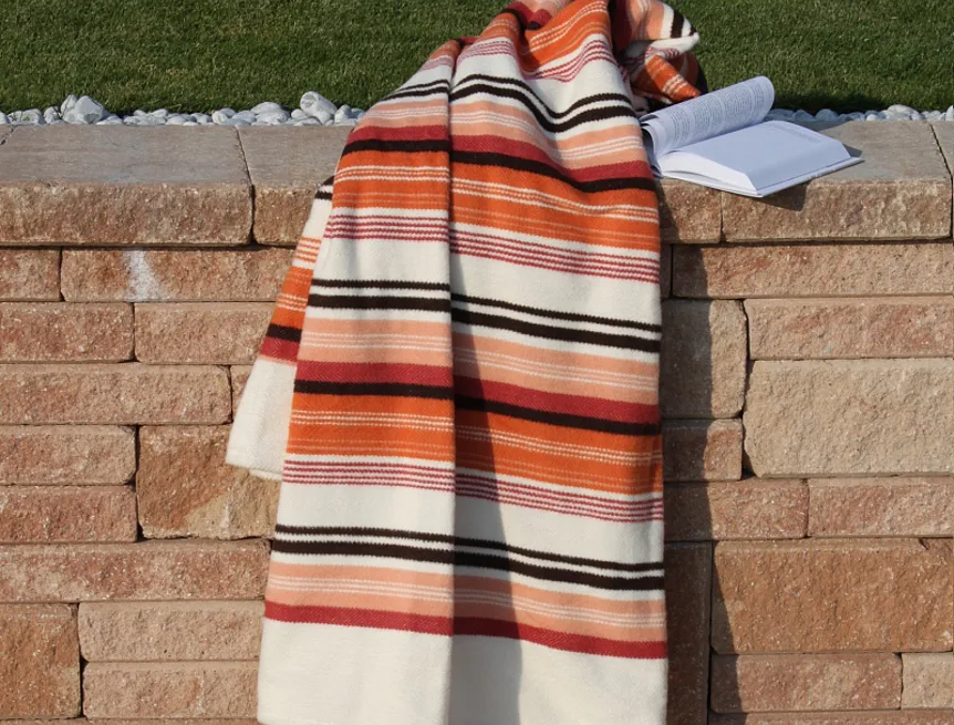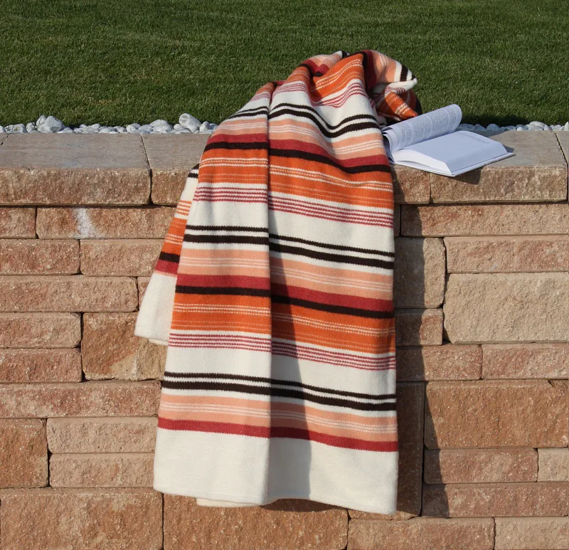 Hravé a jednoduše nadčasové proužky v kombinaci s jemnými pastelovými tóny, vystihují novou kolekci letních dek. Mimořádně měkký a jemný povrch si budete rádi užívat nejen o chladných letních večerech. Na bílém podkladu se střídají různě široké pruhy oranžové, lososové, cihlové a hnědé barvy. Deka má dva konce zapošité a dva volné.
