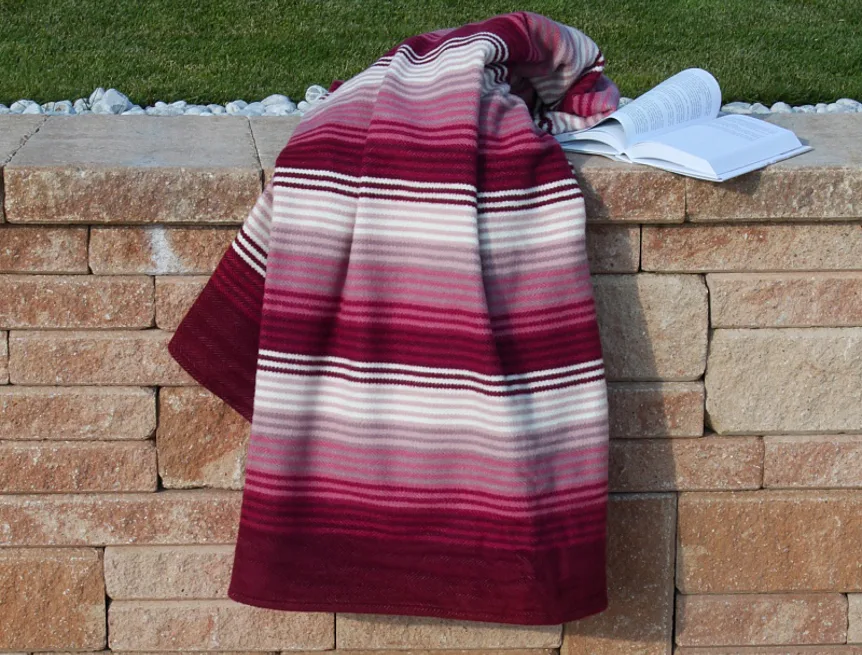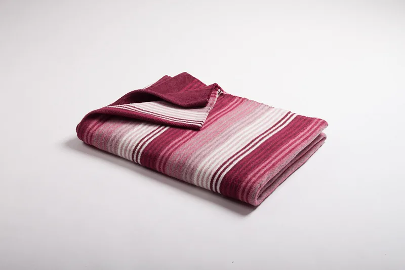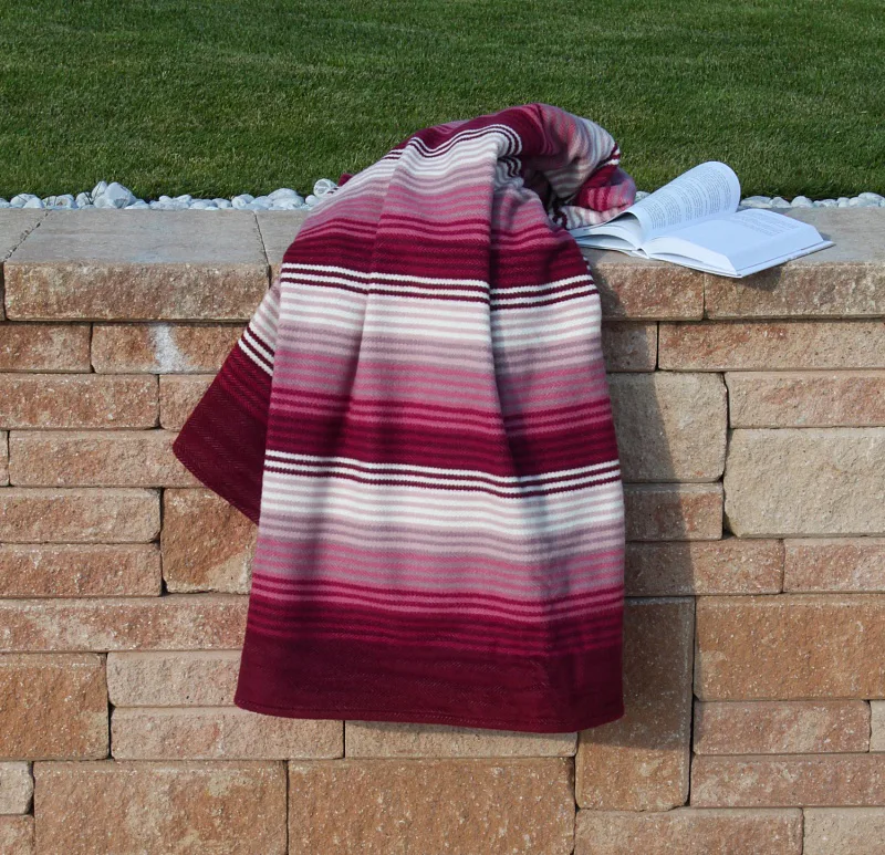 Hravé a jednoduše nadčasové proužky v kombinaci s jemnými pastelovými tóny, vystihují novou kolekci letních dek. Mimořádně měkký a jemný povrch si budete rádi užívat nejen o chladných letních večerech. Vínový základ deky se střídajícími se pruhy bílé, bordó, světle růžové, starorůžové a růžové barvy. Deka má dva konce zapošité a dva volné.