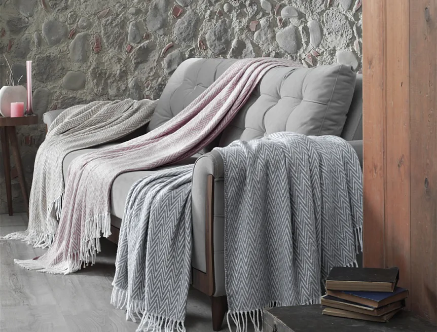 Tuto trendy deku můžete využít také jako ozdobný přehoz. Všechny deky jsou opatřeny třásněmi na dvou krajích, zbylé dva kraje jsou jemně obšité.