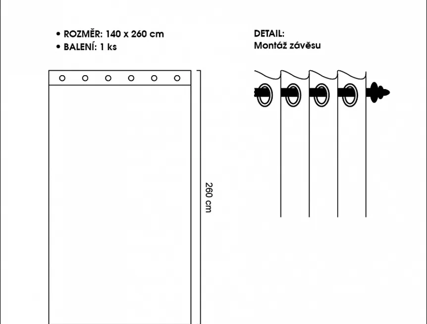 Balení: 1 ks závěsu, včetně kovových ok, pro pohodlné zavěšení na tyč (vnitřní rozměr oka - 4 cm)