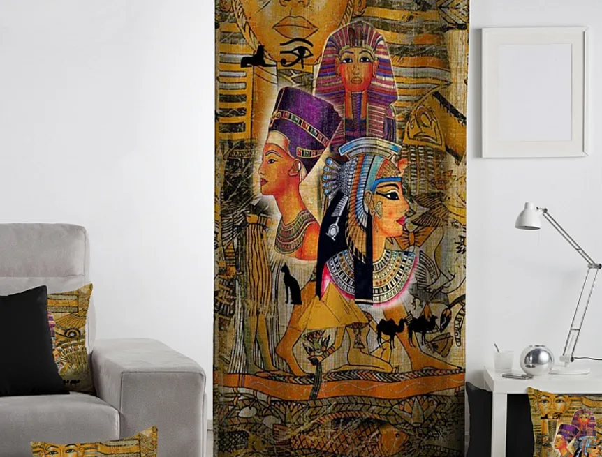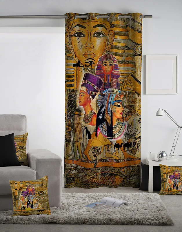 Exkluzivní kolekce dekoračních závěsů přináší mimořádný zážitek a věrné provedení detailu. To vše díky nejmodernější digitální technologii tisku. Nádherná kombinace barev a starověkých motivů v podání závěsu EGYPT. Okouzlující odstíny okrové a hnědé v kombinaci s výraznou fialovou prozáří každý okamžik. Jistě oceníte i látku s velmi hustou a pevnou strukturou, vyrobenou ze 100% bavlny, kterou jsme opatřili tzv. sametovým povrchem. Potisk je jednostranný.