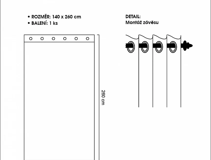 Balení: 1 ks závěsu, včetně kovových ok, pro pohodlné zavěšení na tyč (vnitřní rozměr oka - 4 cm)