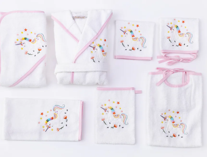 Kromě praktičnosti a využitelnosti všech doplňků přináší tento set i okouzlující design, který podtrhují propracované roztomilé výšivky a barevně sladěné lemování. Dárková froté výbavička Unicorn s výšivkou oblíbeného jednorožce je díky růžovému lemování vhodná pro malé princezny.