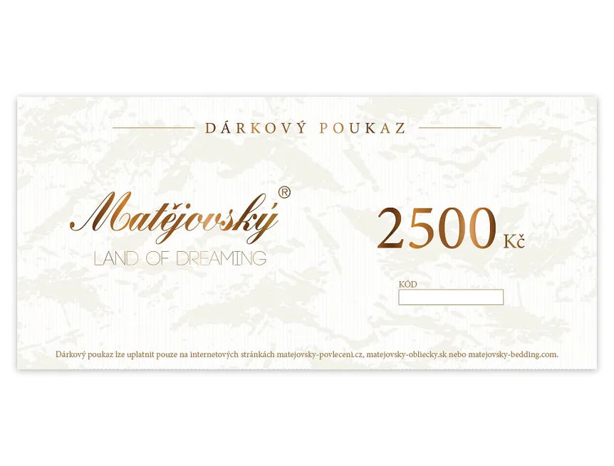 Jedná se o poukaz v elektronické formě, který si budete moci vyzvednout online z našich stránek ihned po zaplacení. Odkaz na vyzvednutí poukazu obdržíte v e-mailu o potvrzení objednávky. Poukaz lze využít pouze na e-shopu www.matejovsky-povleceni.cz nebo v kamenné prodejně v Semilech. Platnost poukazu je 1 rok od zakoupení.