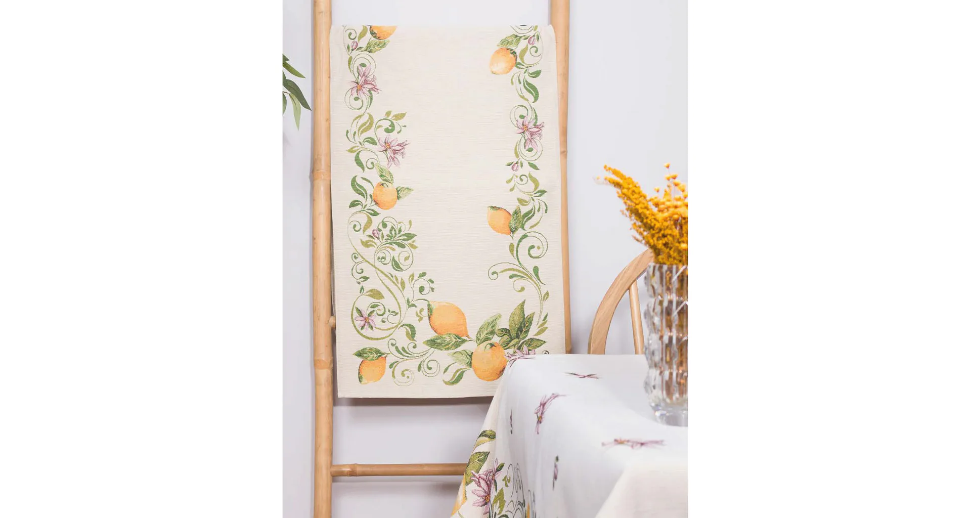 Ubrus Lima zdobený citrusy a jemnými květy je ideální doplněk pro každou příležitost. Elegantní design s rustikálním nádechem se pojí s praktičností díky pevnému a odolnému materiálu.