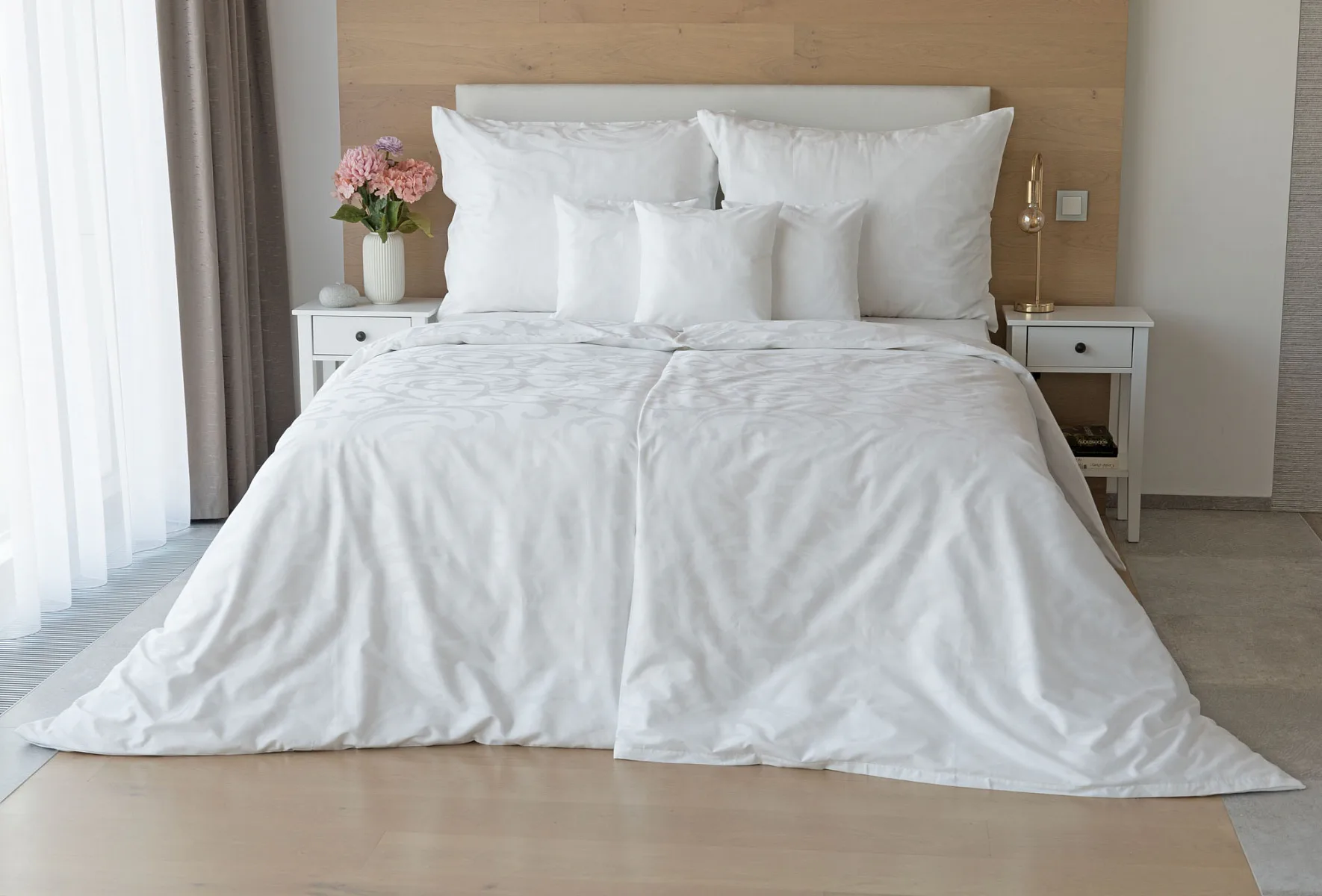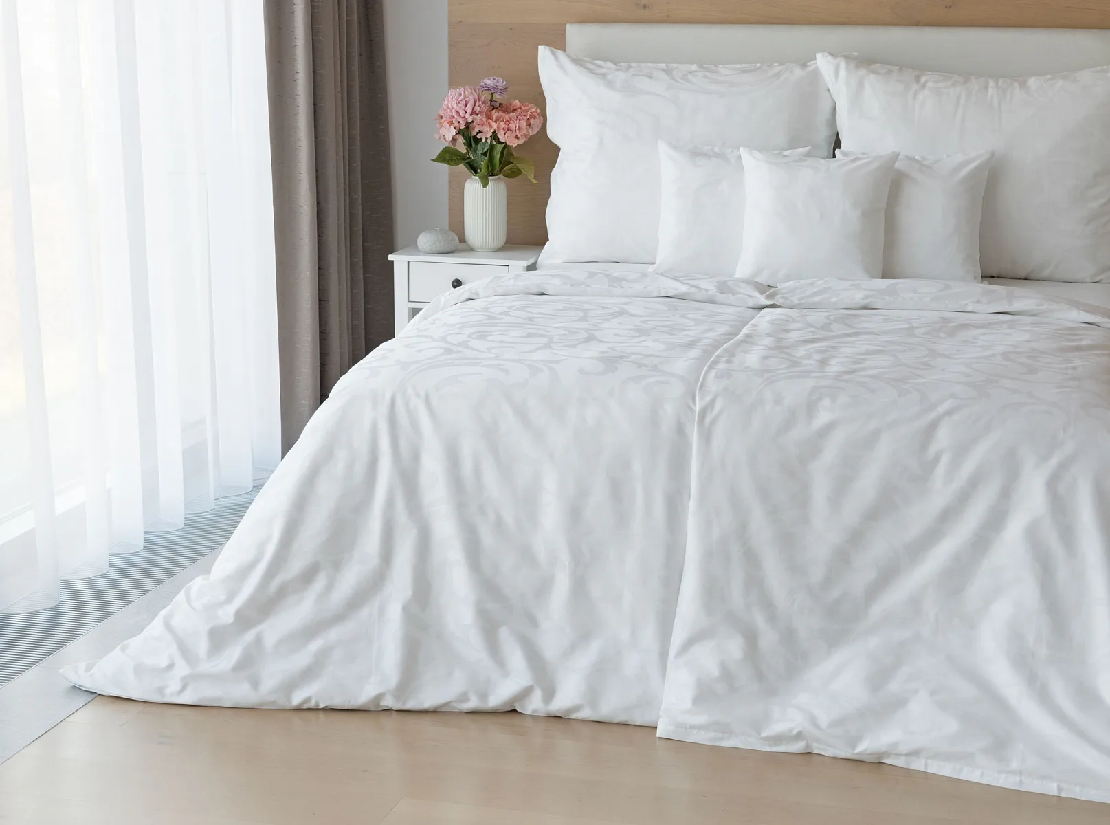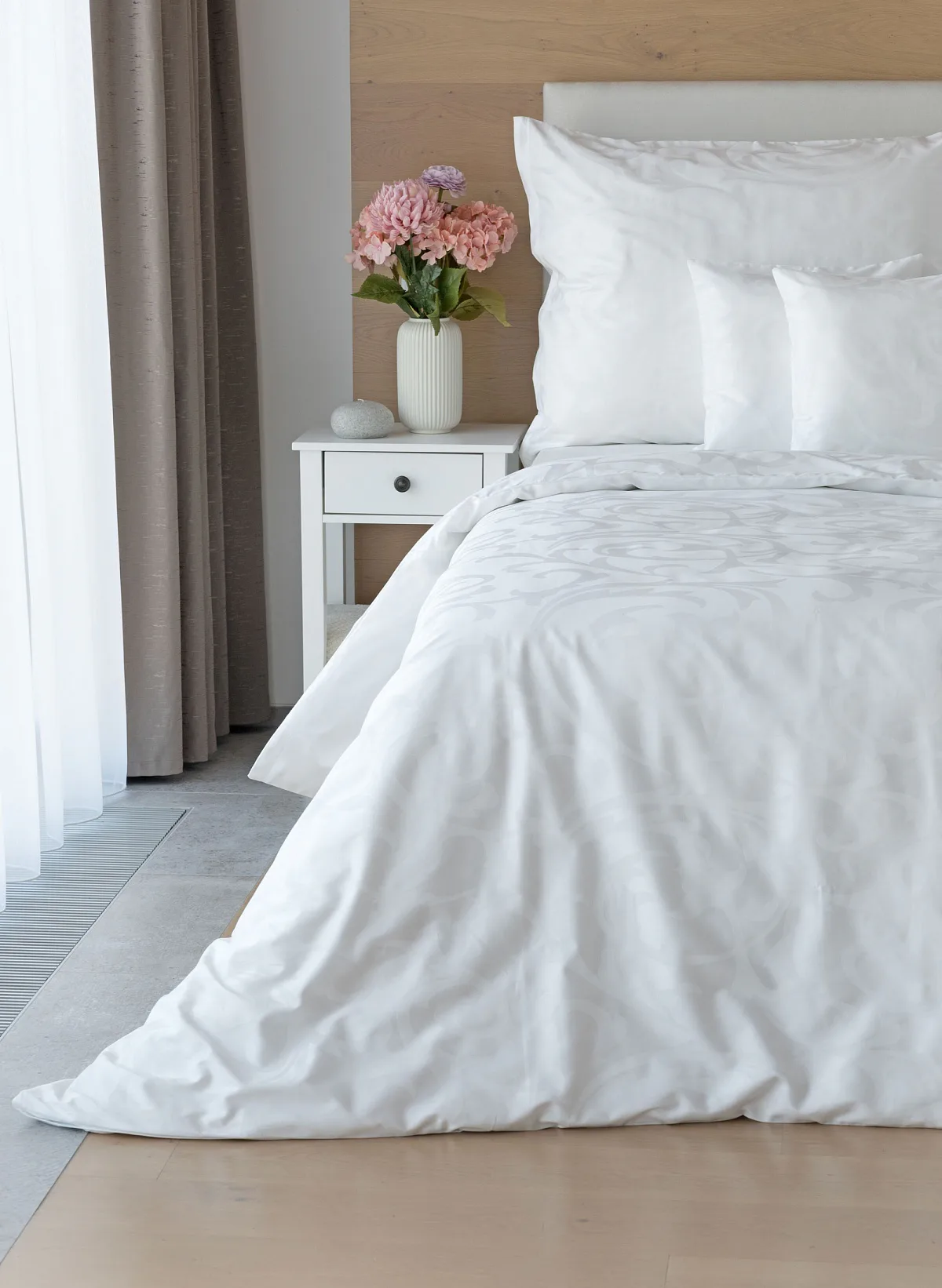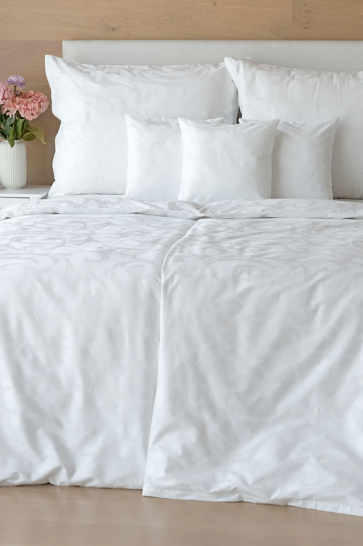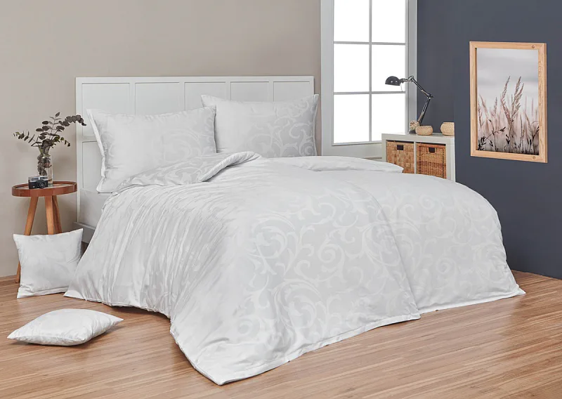 Čistě bílé damaškové povlečení v luxusním žakárovém provedení s decentním vzorem, který působí na lůžku víc než elegantně. Povlečení je vyrobeno z vysoce kvalitní česané a mercerované bavlněné příze.