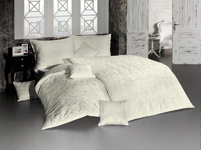 Světle béžové damaškové povlečení v luxusním žakárovém provedení s decentním vzorem, který působí na lůžku víc než elegantně. Povlečení je vyrobeno z vysoce kvalitní česané a mercerované bavlněné příze.