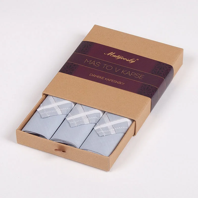 Elegance dotažená do posledního detailu. Tradiční bavlněný kapesník je nejen praktickým pomocníkem v celé řadě každodenních okamžiků, ale také symbolem elegance a vytříbeného stylu. Sada tří barevně sladěných látkových kapesníků, které vynikají hebkostí a savostí, se i díky originálnímu balení stane ideálním dárkem pro každou dámu.