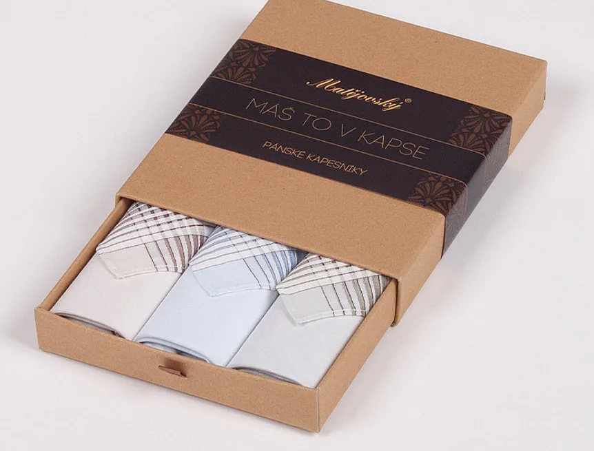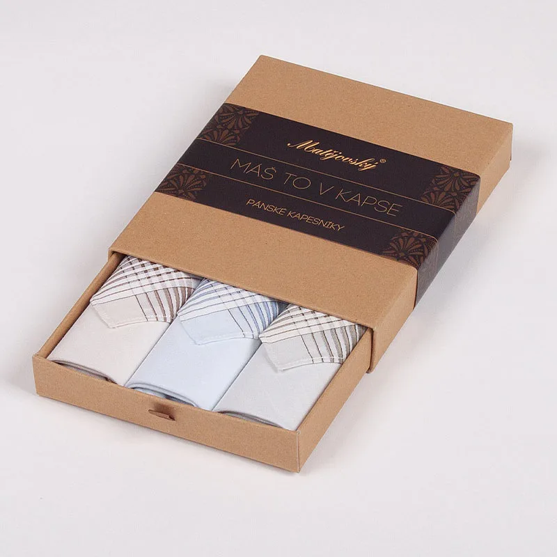 Elegance dotažená do posledního detailu. Tradiční bavlněný kapesník je nejen praktickým pomocníkem v celé řadě každodenních okamžiků, ale také symbolem elegance a vytříbeného stylu. Sada tří barevně sladěných látkových kapesníků, které vynikají hebkostí a savostí, se i díky originálnímu balení stane ideálním dárkem pro moderního gentlemana.