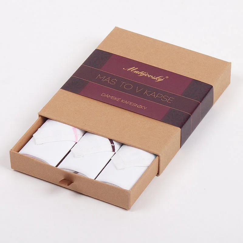 Elegance dotažená do posledního detailu. Tradiční bavlněný kapesník je nejen praktickým pomocníkem v celé řadě každodenních okamžiků, ale také symbolem elegance a vytříbeného stylu. Sada tří barevně sladěných látkových kapesníků, které vynikají hebkostí a savostí, se i díky originálnímu balení stane ideálním dárkem pro každou dámu.