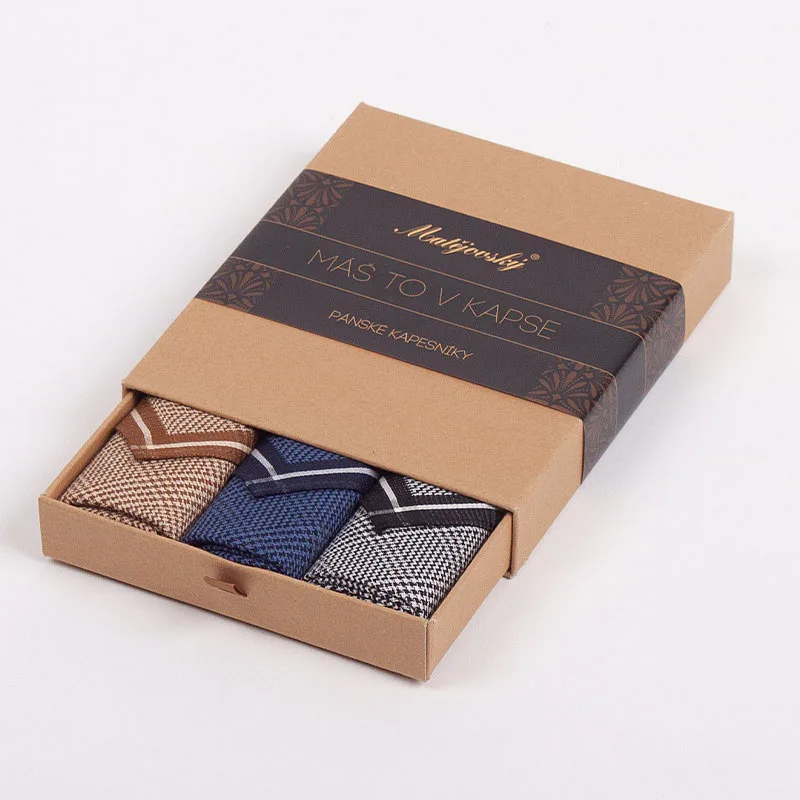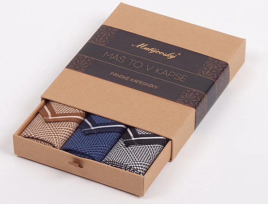 Elegance dotažená do posledního detailu. Tradiční bavlněný kapesník je nejen praktickým pomocníkem v celé řadě každodenních okamžiků, ale také symbolem elegance a vytříbeného stylu. Sada tří barevně sladěných látkových kapesníků, které vynikají hebkostí a savostí, se i díky originálnímu balení stane ideálním dárkem pro moderního gentlemana.