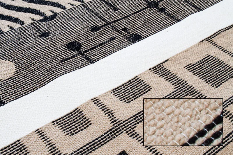 Dekorační tkaný kobereček s krásnou texturou je novinkou v sortimentu a doplňuje designové řady nejoblíbenějších geometrických motivů. Nyní si můžete sladit interiér opravdu do posledního detailu. Dezén NOMINE na první pohled zaujme atraktivním vzorem v odstínech černé, hnědé a šedé na přírodním bílém podkladu. Druhá strana koberečku je provedena inverzně (viz další foto). Kobereček je po celém obvodu olemován barevně sladěnou lemovkou.