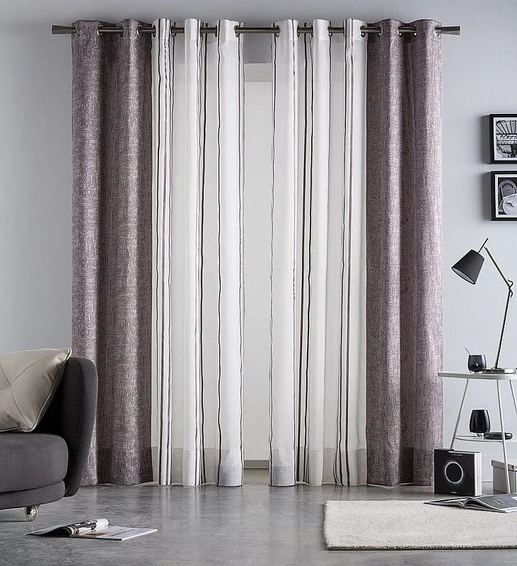 Limitovaná kolekce kombinovaných dekoračních závěsů přináší mimořádný designový kousek. Dodejte interiéru styl okouzlujícím závěsem MARTINA LILA. Dokonale sladěné odstíny starofialové a šedé barvy na částečně zatemňující designové části se skvěle doplňují s průhledným bílým tylem zdobeným svislými starofialovými a šedobéžovými proužky. Obě části na sebe plynule navazují a tvoří tak originální celek. Jemný matný lesk dodává kombinovanému závěsu nadčasovou eleganci.