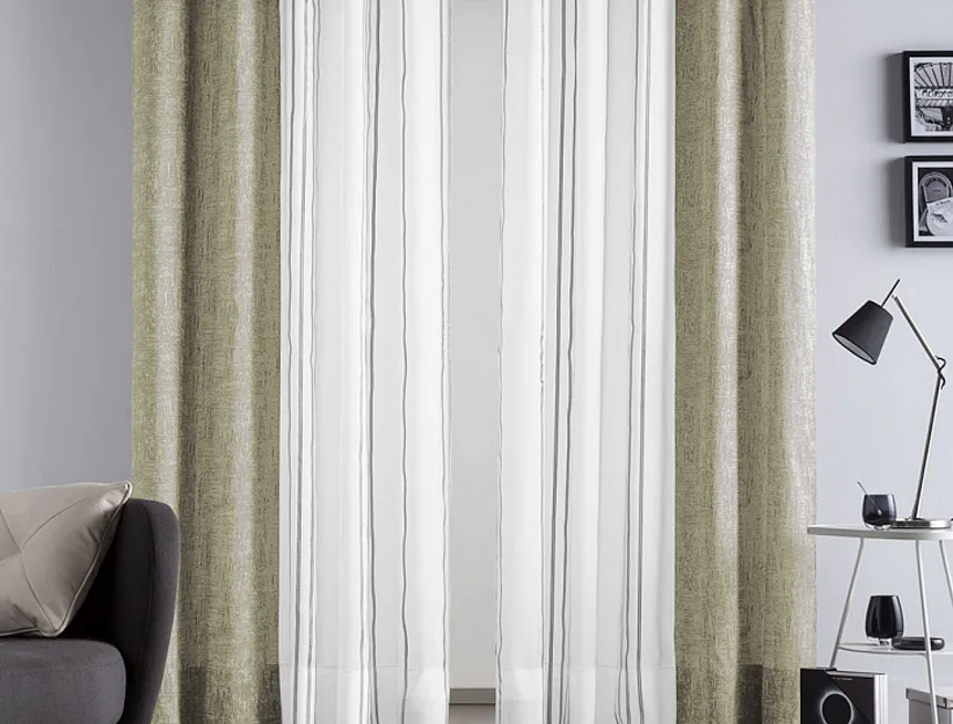 Limitovaná kolekce kombinovaných dekoračních závěsů přináší mimořádný designový kousek. Dodejte interiéru styl okouzlujícím závěsem MARTINA SAND. Dokonale sladěné odstíny zlatavé a krémové barvy na částečně zatemňující designové části se skvěle doplňují s průhledným bílým tylem zdobeným svislými zlatavými proužky. Obě části na sebe plynule navazují a tvoří tak originální celek. Jemný matný lesk dodává kombinovanému závěsu nadčasovou eleganci.