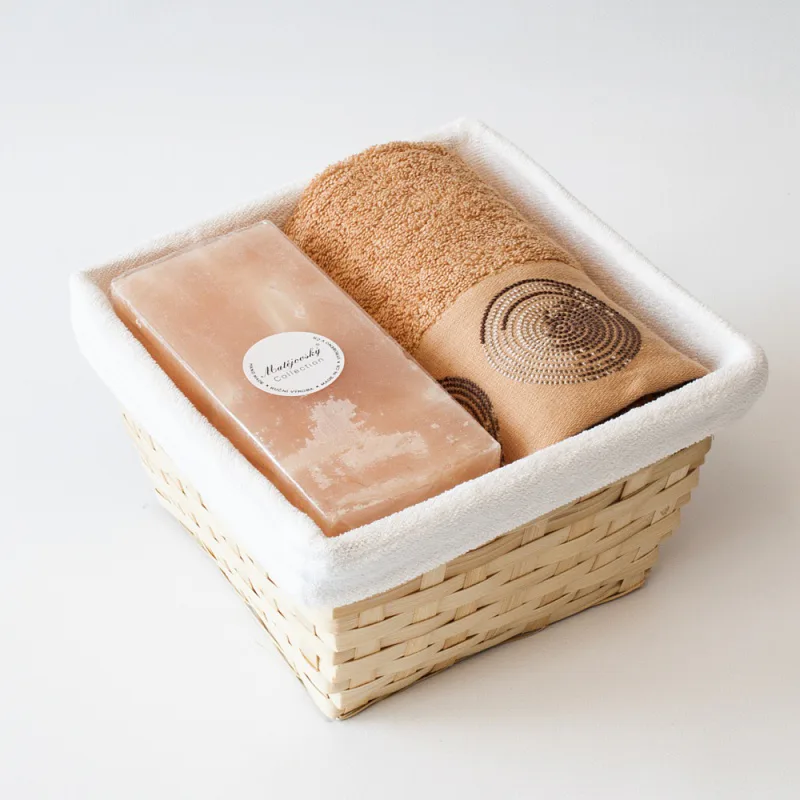 Balení obsahuje barevně sladěný set ručníku a ručně vyráběné vonné svíčky.