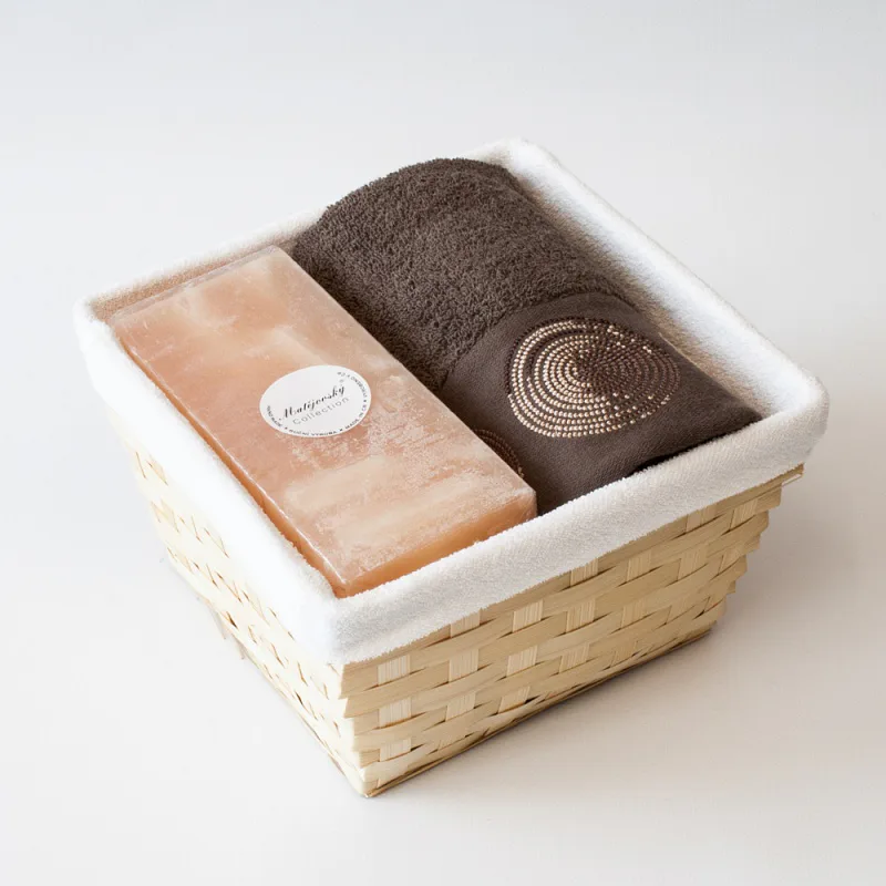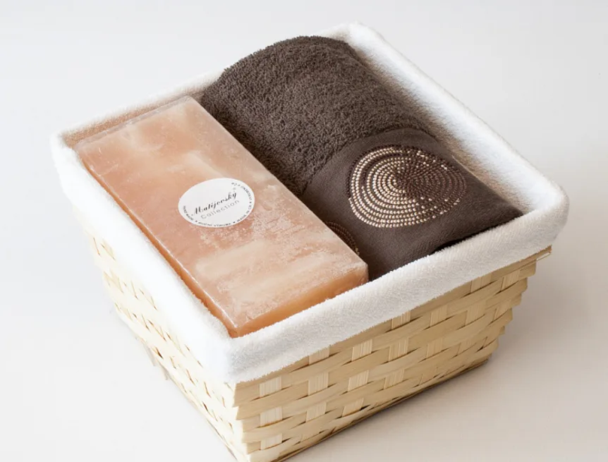 Balení obsahuje barevně sladěný set ručníku a ručně vyráběné vonné svíčky.