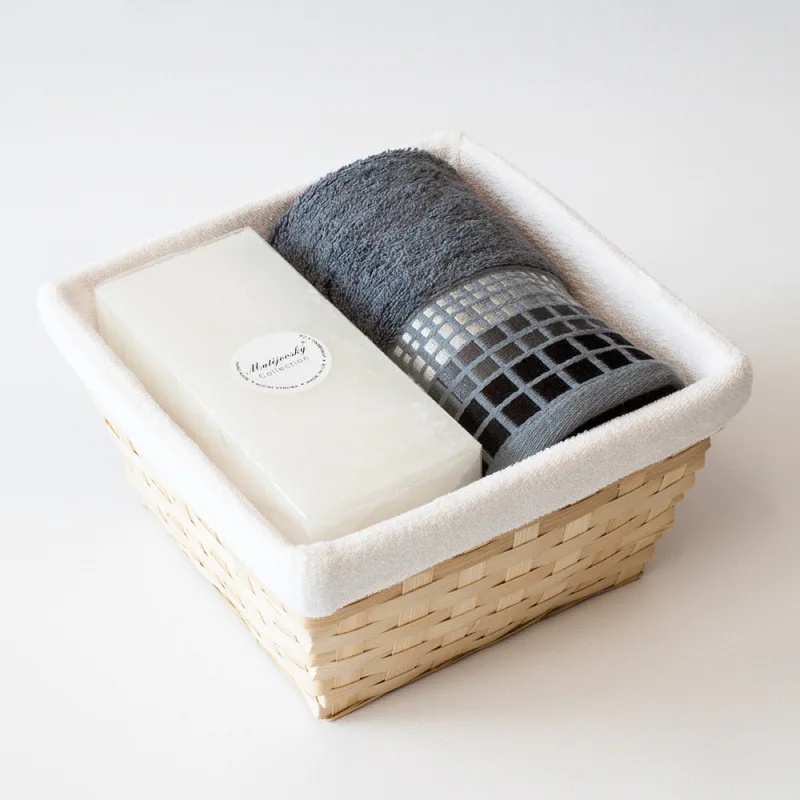 Balení obsahuje barevně sladěný set ručníku a ručně vyráběné vonné svíčky.