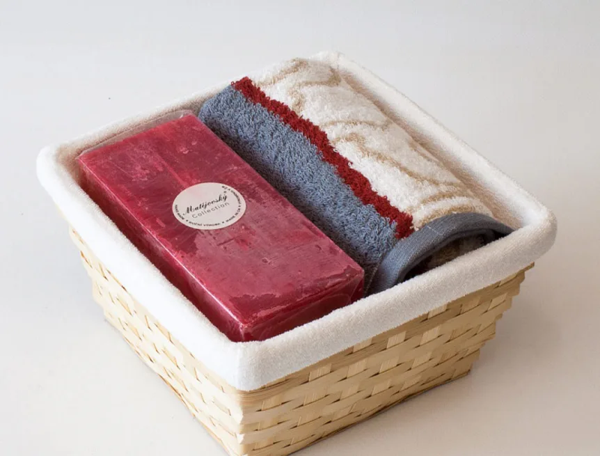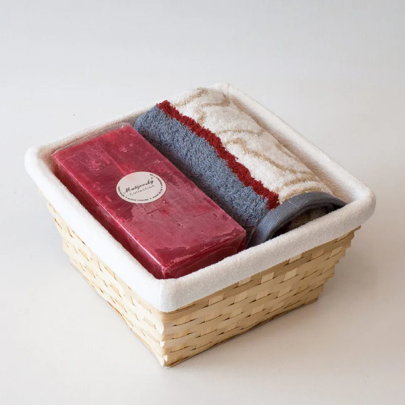 Proutěný košík a bílá textilní vsadka jsou součástí dárkového balení.