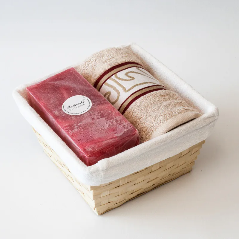 Balení obsahuje barevně sladěný set ručníku a ručně vyráběné vonné svíčky.