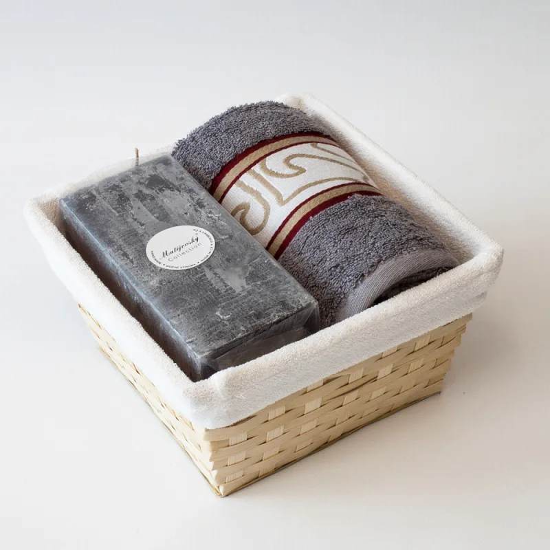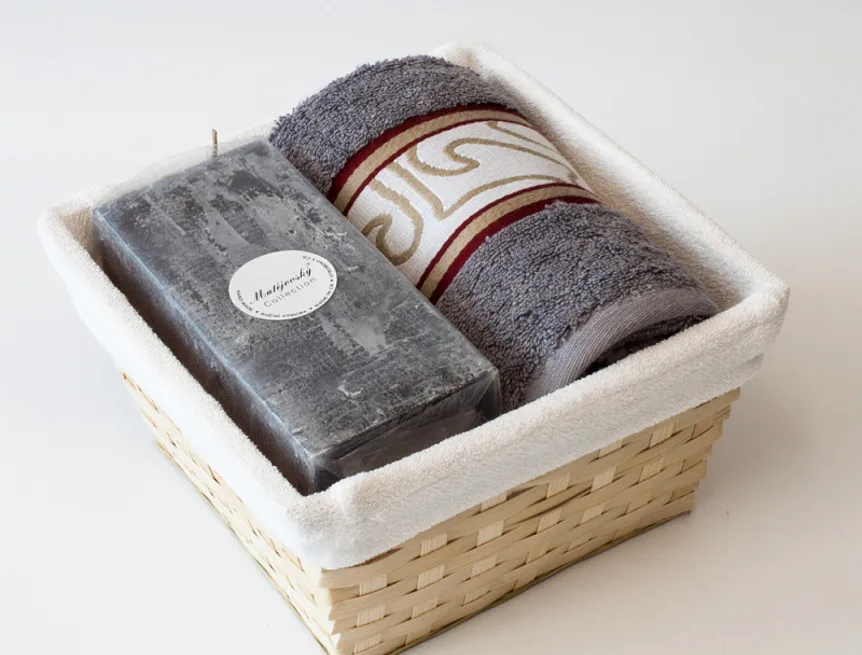 Balení obsahuje barevně sladěný set ručníku a ručně vyráběné vonné svíčky.