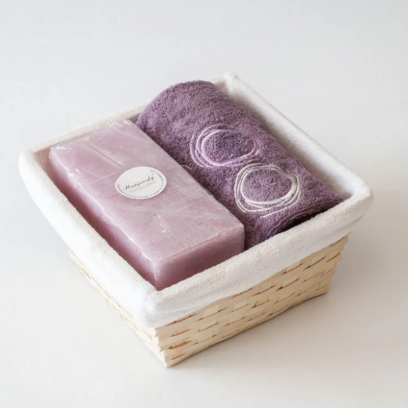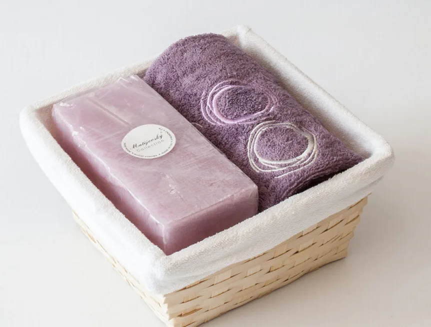 Balení obsahuje barevně sladěný set ručníku a ručně vyráběné vonné svíčky.