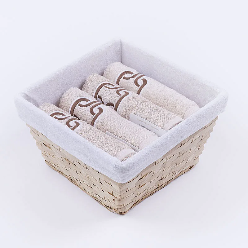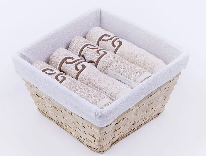 Košík s textilní vsadkou je součástí balení. Ručníky jsou opatřeny poutkem.